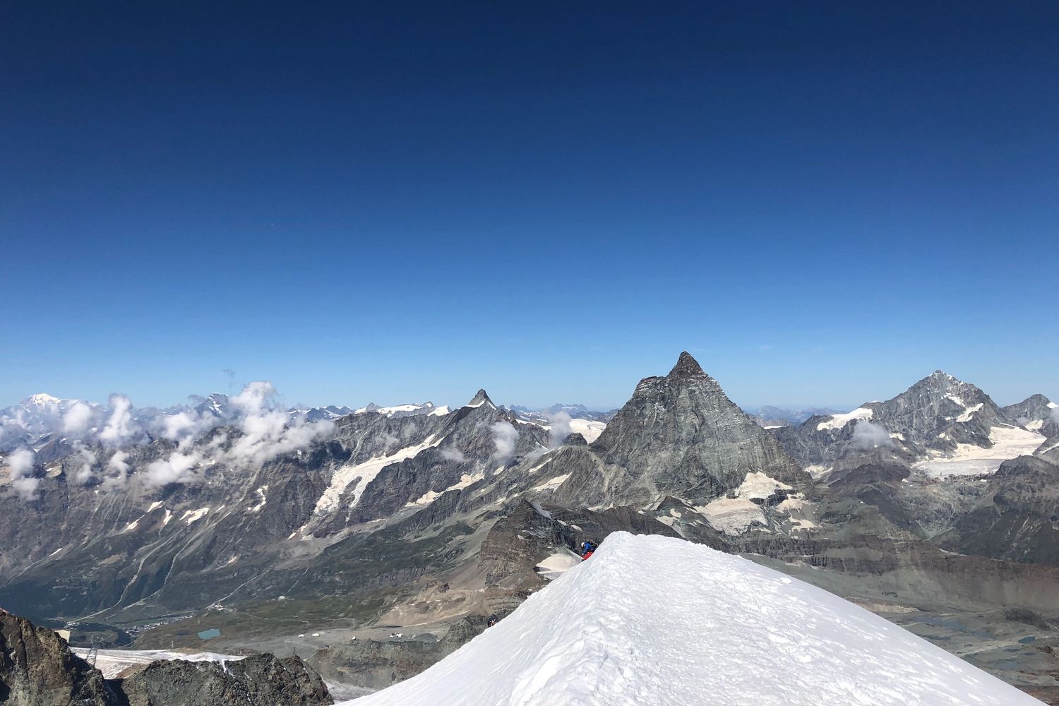 From Cervinia, you take the gondola and reach Plateau Rosa in 30 minutes. From there, In 3 to 4 hours, you will be in the summit and enjoy an outstanding view of the surrounding mountains, first among them the Matterhorn, but also Monterosa and many others.